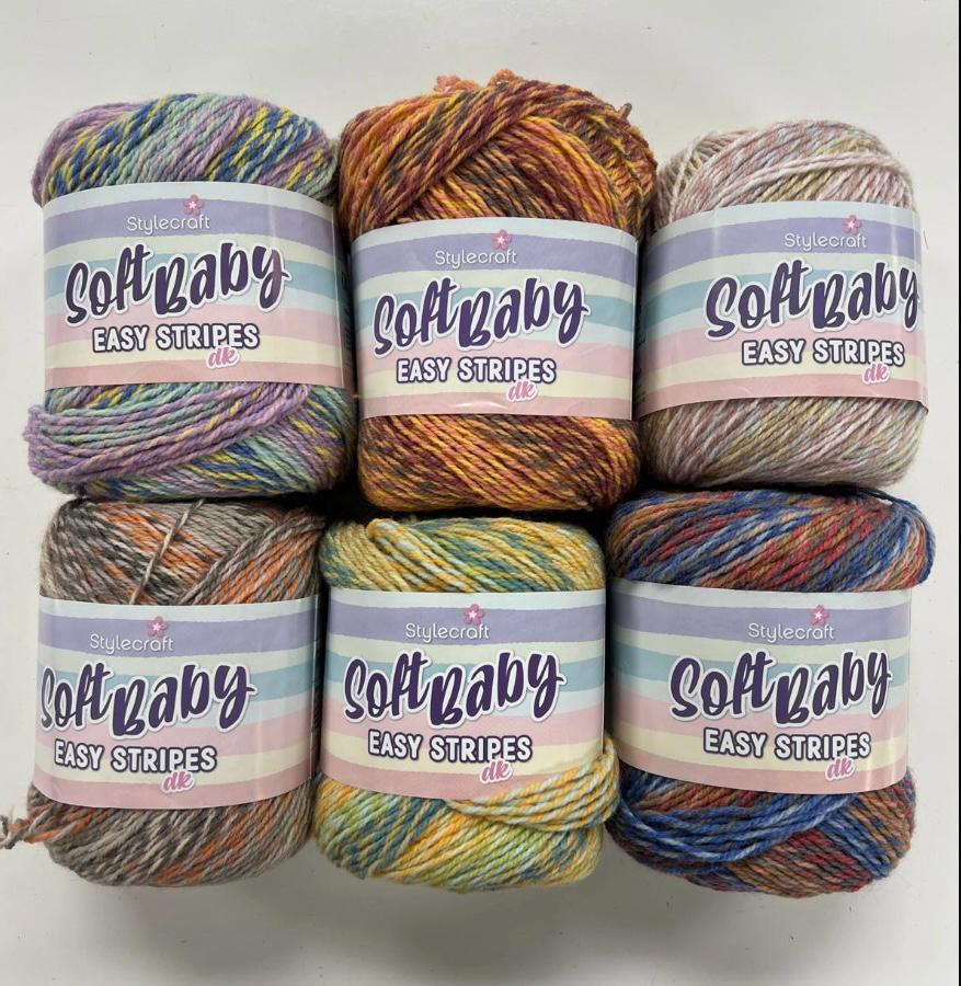 Soft Baby Easy Stripes is a self-striping yarn designed with both beauty and practicality in mind. Crafted from a gentle blend of acrylic and nylon, it offers a super-soft texture that’s kind to baby’s delicate skin, while being durable and machine washable for everyday ease.